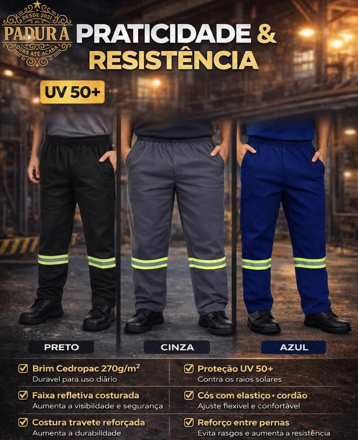Calça de Brim profissional CEDRO , com reforço entre pernas e faixa refletiva, desenvolvida para quem precisa de resistência, durabilidade, segurança e conforto. Conta com reforço entre as pernas , oferecendo maior segurança contra desgaste, aumento da vida útil da peça e excelente desempenho em rotinas de trabalho intenso. Ideal para indústrias, obras, manutenção, logística, serviços gerais e campo, garantindo visual padronizado e mais proteção em ambientes que bloqueiam atenção e entrega constante. Diferenciais do produto: - Tecido Brim resistente da marca CEDRO - Reforço entre pernas garantindo maior durabilidade - Conforto e ótimo caimento para longas jornadas - Excelente custo-benefício para uniformização |